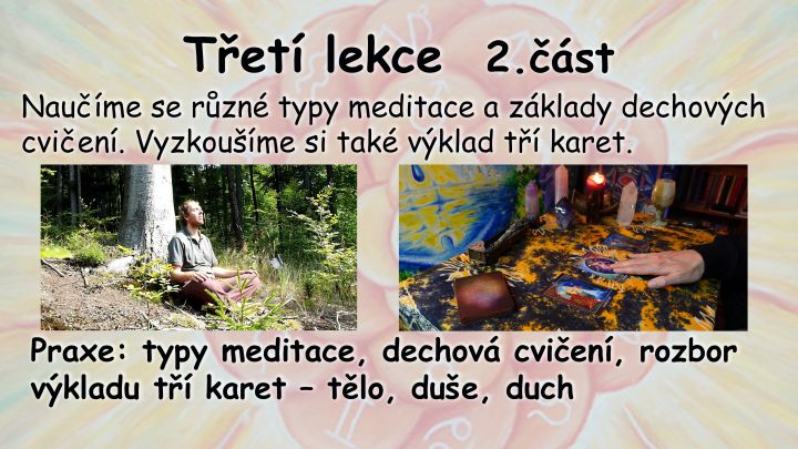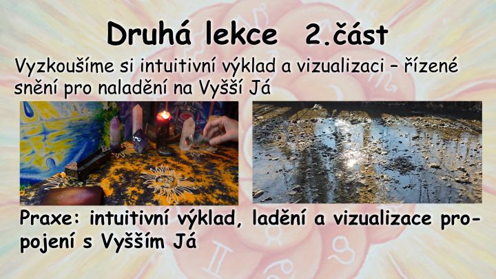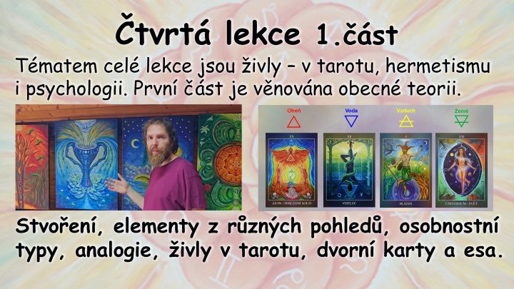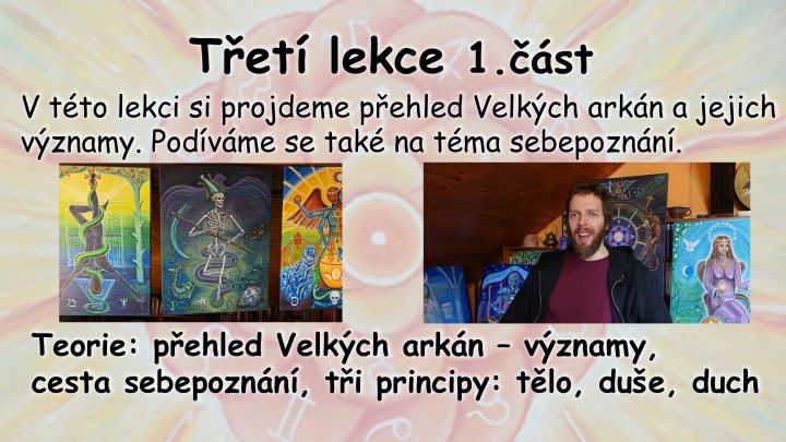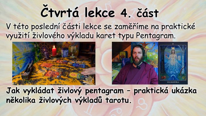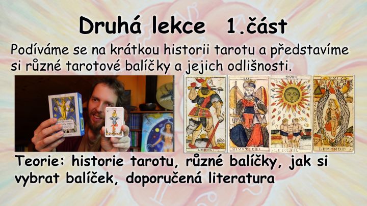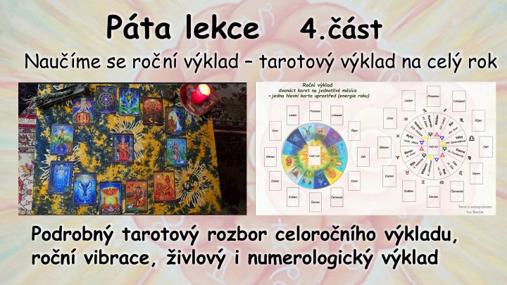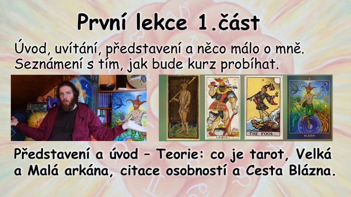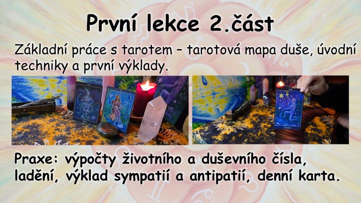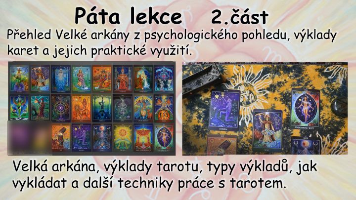 Každá lekce obsahuje teoretickou část, kde si vysvětlíme klíčové principy a souvislosti, a zároveň praktickou část, ve které si ukážeme konkrétní výklady, cvičení a způsoby, jak s tarotem skutečně pracovat.